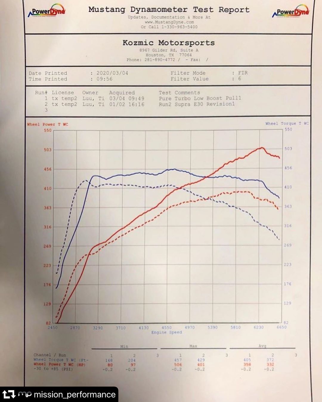 A90 Supra Dyno of stock turbo vs Pure 800401whp – Stock turbo w/ E30 tune506…