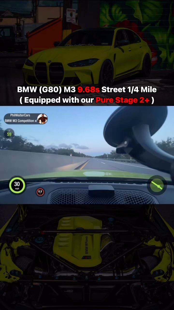 @philwaltercars BMW (G80) M3 Competition xDrive equipped with a set of our S58 Pure Stage 2+ just casually doing a 9.68s 1/4 mile on the streets π Certified Rocketship π