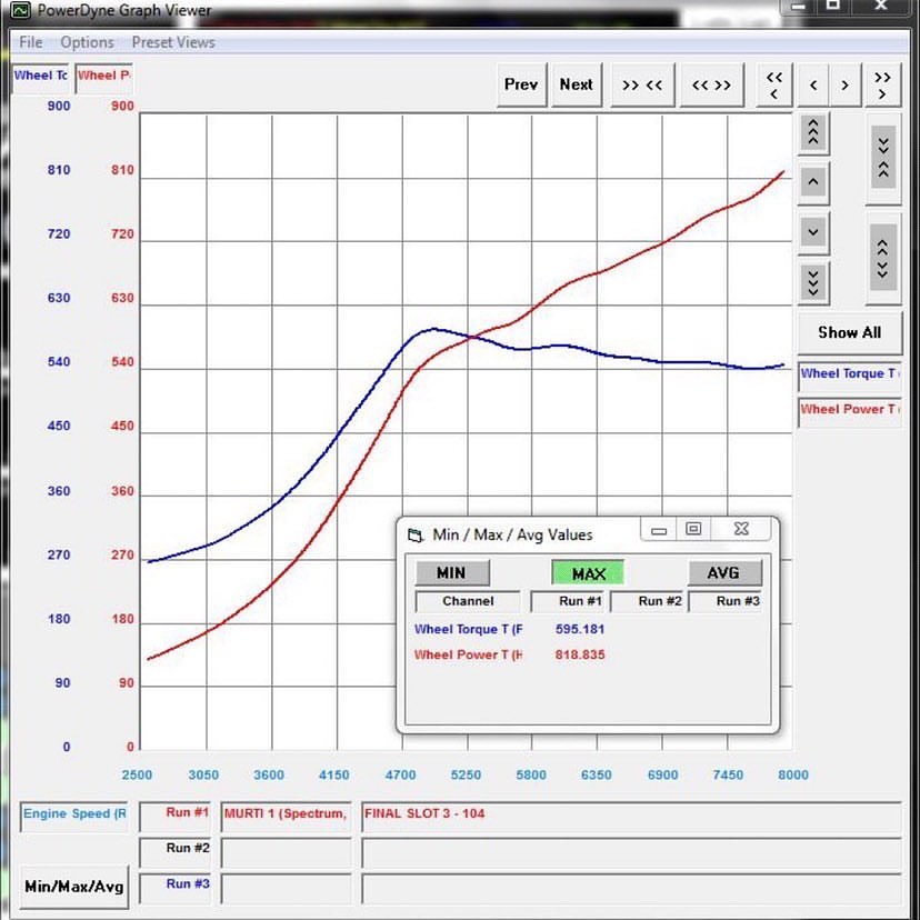 @shlickedm put down 818whp on race gas! 💪 He’s running our Pure 900’s and @dyno_spectrum knocked it out of the park tuning this beast! Look at those turbos holding power all the way to 8K RPM’s!!!!🏎💨💨🚀🚀💪