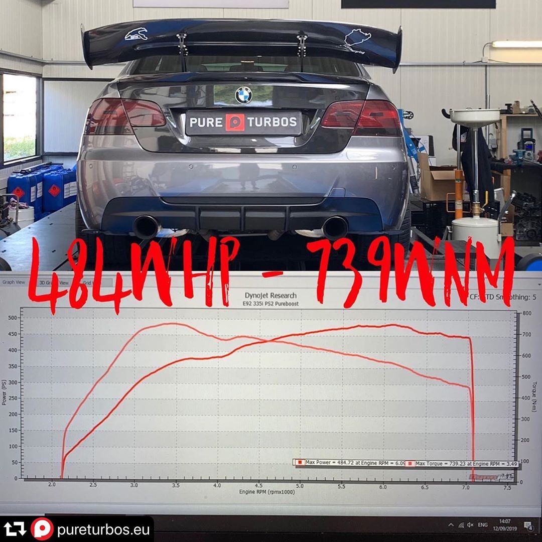484 whp and 739 wnm on 98 ron fuel for this e92 335i N54! Custom tuned over @mhd.tuning by @pureboost.de 💨Pure 600 cast turbos