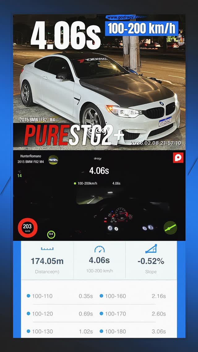 Is this a new @dragymotorsports 100-200km/h World Record? 👀 Equipped with our S55 Pure Stage 2+ @_tiagoromano ‘s 2015 BMW (F82) M4 is moving! 🏎️💨