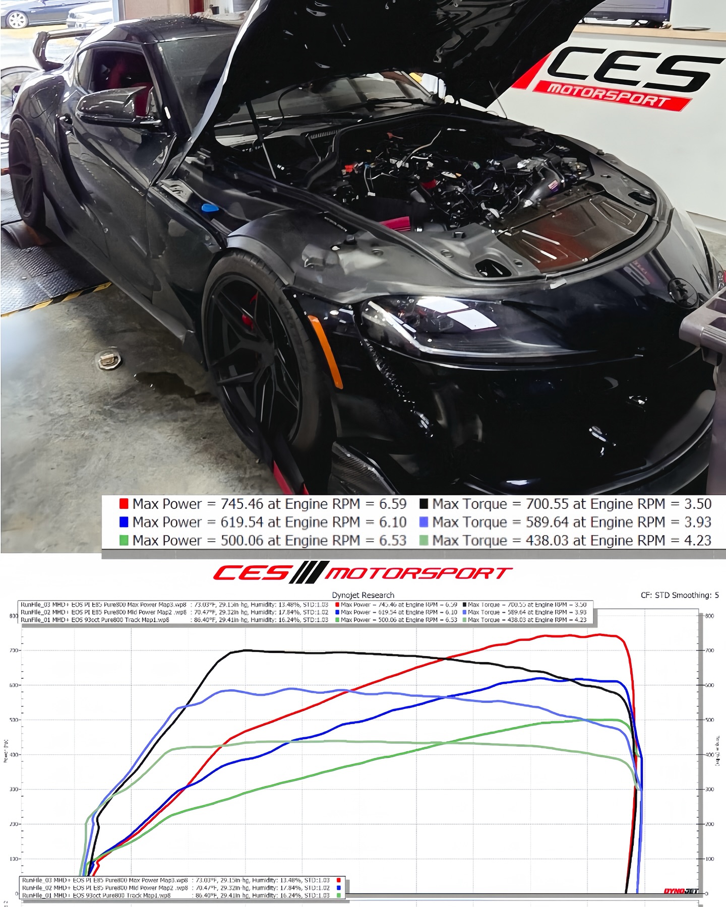 Our friends at @cesmotorsport took this A90 Supra (2-Port) equipped with our Pure800 Upgrade and sent it!๐ Giving the customer 3 maps tuned on @mhd.tuning (MHD+) This B58 Monster is ready to do some damage!