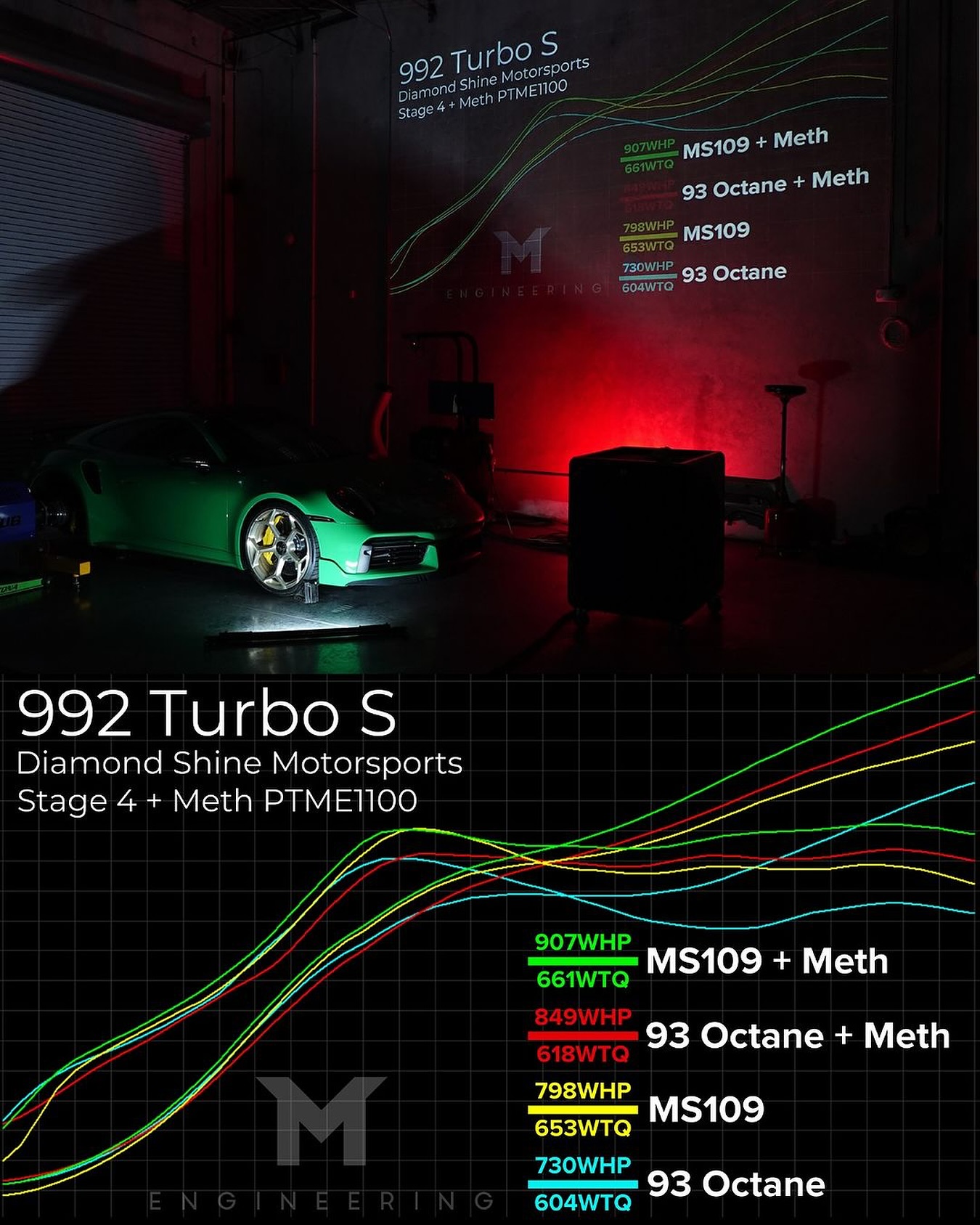 Our friends at @m_engineering_llc took this Porsche 992 Turbo S equipped with a set of our PTME1100βs π and put down 907WHP on their Mainline ProHub Dyno!