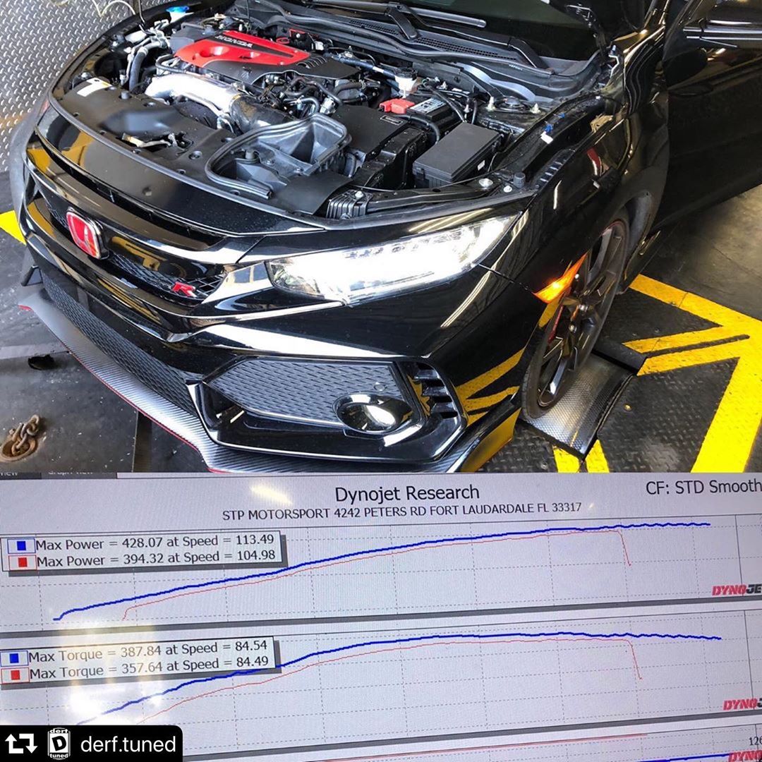 Fk8 Type R in today. @pureturbos Pure 550 upgraded turbo laying down 428hp 387trq on 93 octane 💪🏼📈💻 #DerfTuned #fk8 #TypeR #hondatuning #hondata #pureturbos #stpmotorsports #honda #civictyper #turbo #turbocivic #hondapower #repost