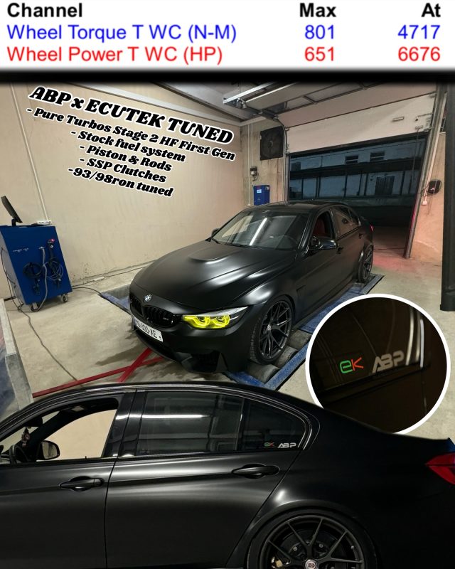 S55 F80 at the shop getting our custom 93/98 ron tune on @ecutek_technologies with some @pureturbos stage 2 HF (first gen) turbos! @mustangdynamometer Dyno results -651 WHP / -801 WTQ (93/98 ron tune) This car stock fuel system...