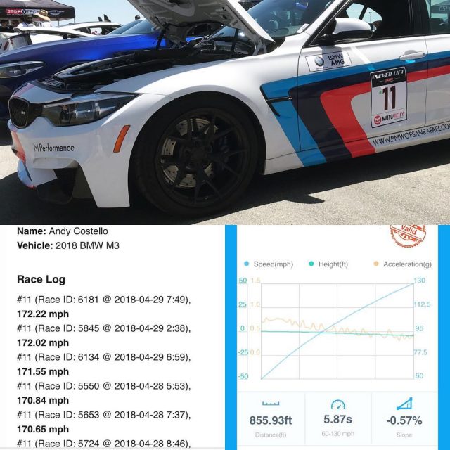 Andy Costello setting the BMW F8x record at the @shifts3ctor Never Lift standing 1/2 mile event this past weekend.๐Ÿ˜Ž The @bmwofsanrafael M3 drove 200mi to the event, ran 172.22mph and many more 170โ€™s all weekend long...